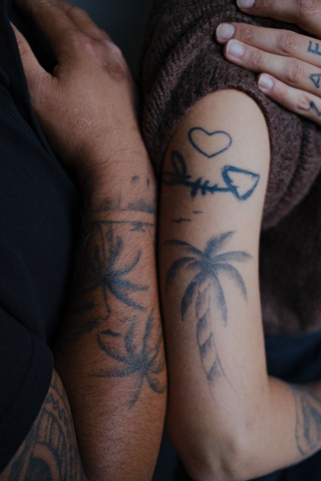 Sanne en Taubu lieten allebei een palmboom van Kiribati op hun arm tatoeëren. FOTO JAGODA LASOTA